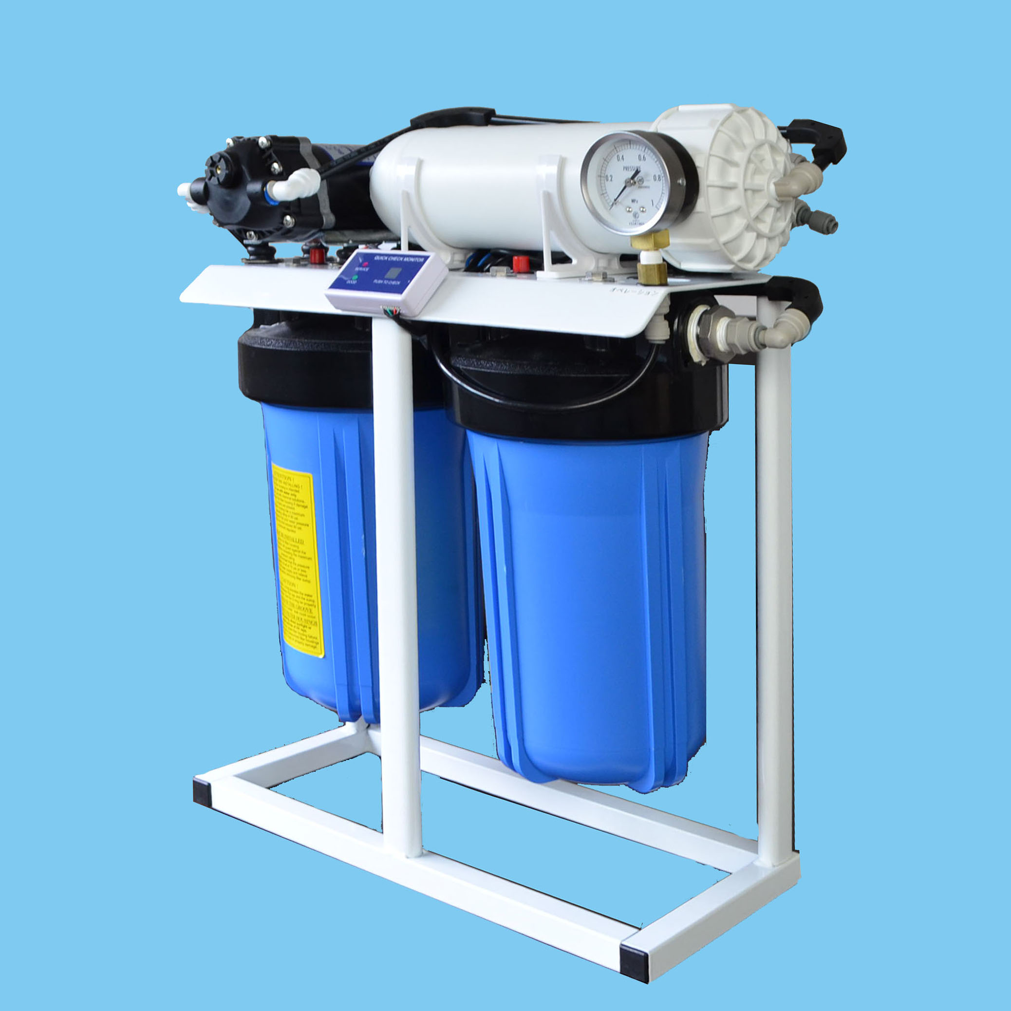 小型店舗の厨房に収まるコンパクトな業務用RO浄水器。全ての機器が上部にあり、メンテナンス性に優れています。プレフィルターの10” BBハウジングは3/4”ポートで流入抵抗が低く、十分なフィルター容量を確保しています。